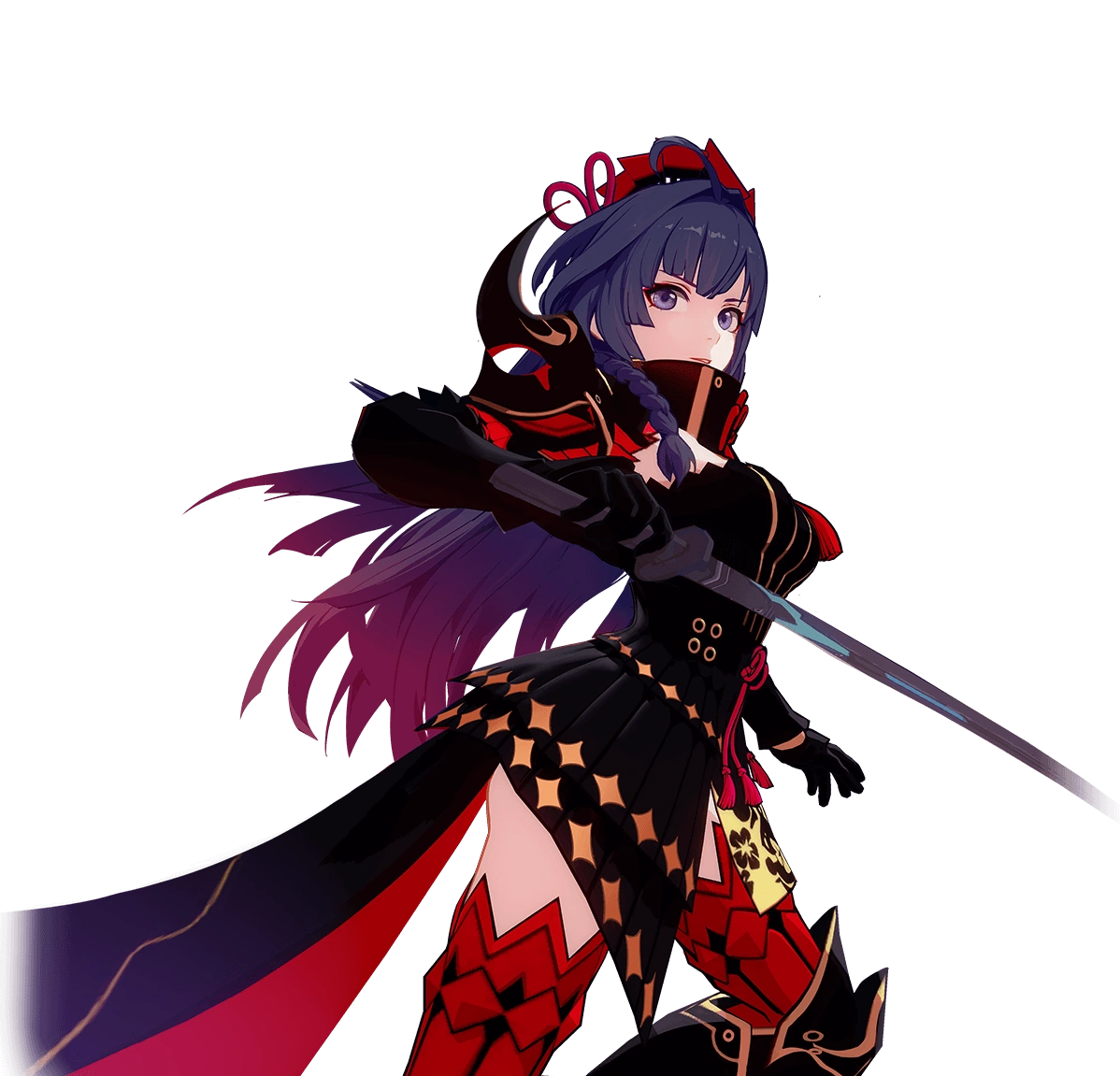 • Herrscher of Thunder: Mei has red eyes and two red horns on her head, and wears a white, black and red suit, black gloves, a black dress, white thigh highs and black shoes.