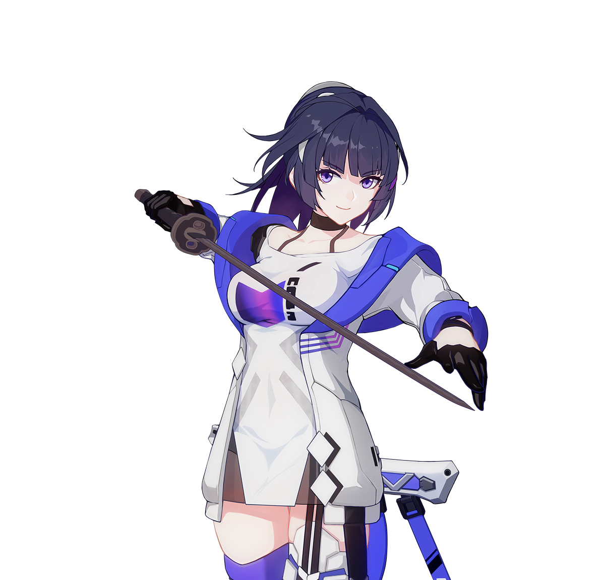 • Striker Fulminata: Mei wears a white and blue hoodie, black gloves, black thigh highs and black shoes. She also has a white and blue scabbard strapped behind her waist.